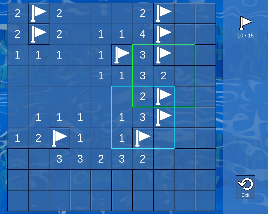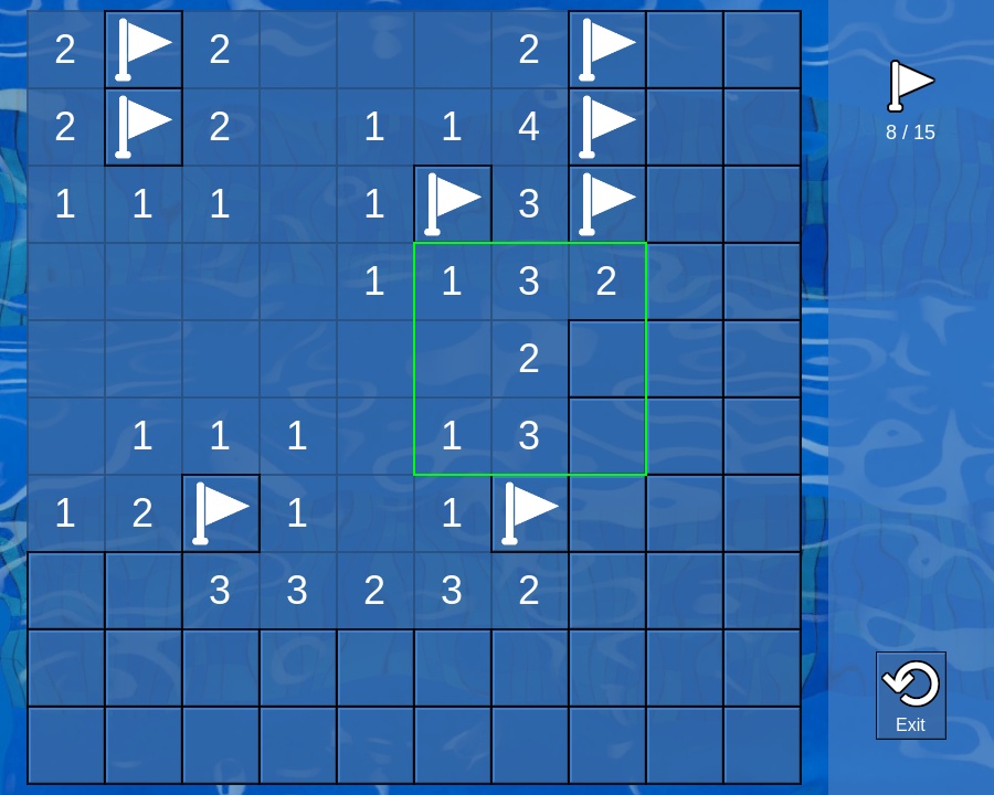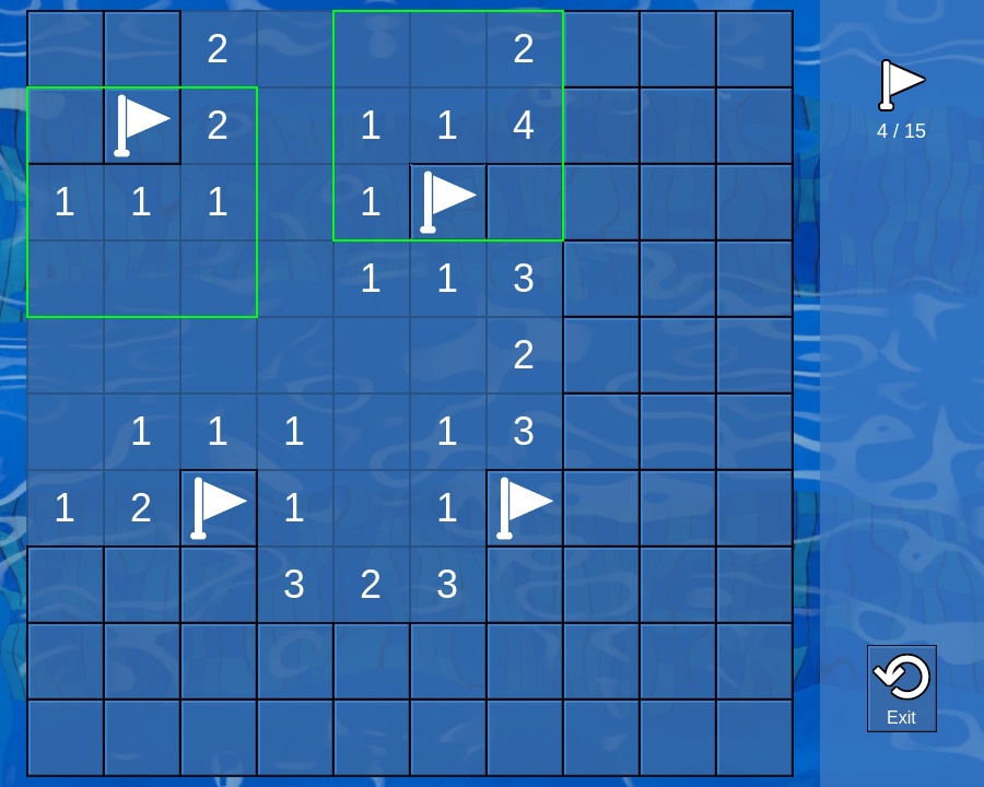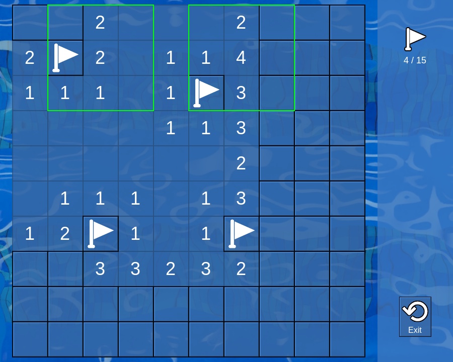 Посмотрим на пару следующих единиц, обведенных квадратами. Рядом с каждой один флажок и одня закрытая ячейка. По одной мине уже есть, значит в ячейках мин быть не может. Нажатие на числе автоматически открывает все ячейки вокруг него, если проставлено нужное количество флажков. И есть еще две единицы в такой же ситуации.