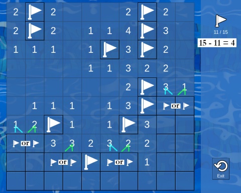 Кстати, помечено уже большинство мин, которые есть на поле. Осталось только четыре. Где они могут быть? Я обозначил возможные позиции маленькими флажками со словом "или" и поставил стрелочки к цифрам, из-за которых должно это быть именно так. Мин как раз 4, то есть все остальные ячейки не содержат мин. Их можно открыть. Подобную логику, опирающуюся на количество оставшихся мин, можно применить нечасто. Но интересные ситуации с количеством в конце игры периодически возникают.