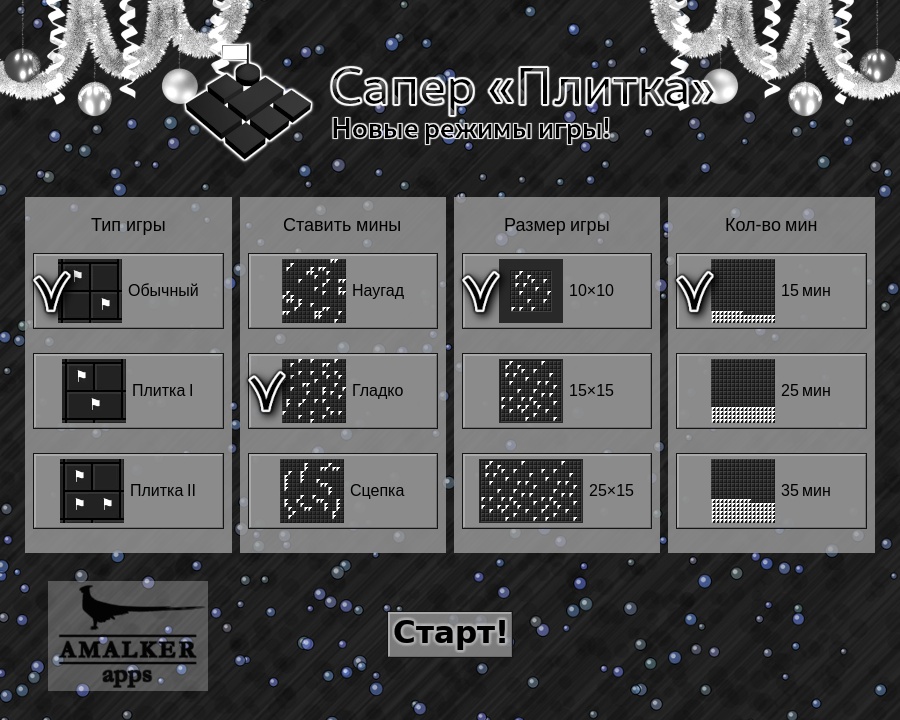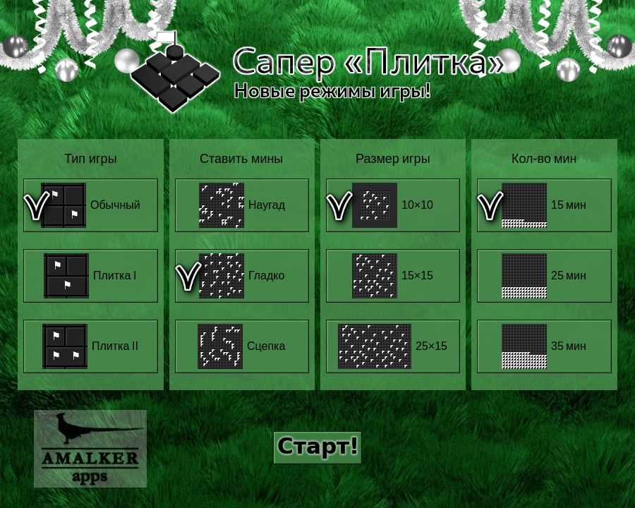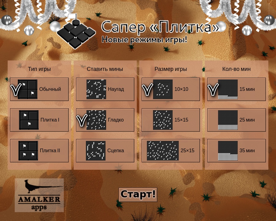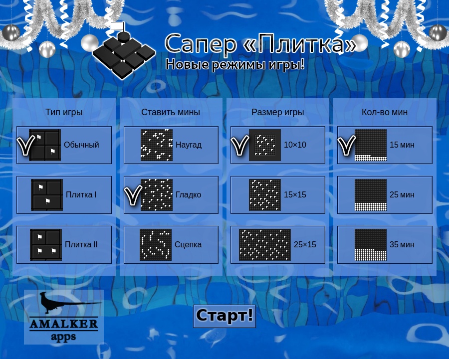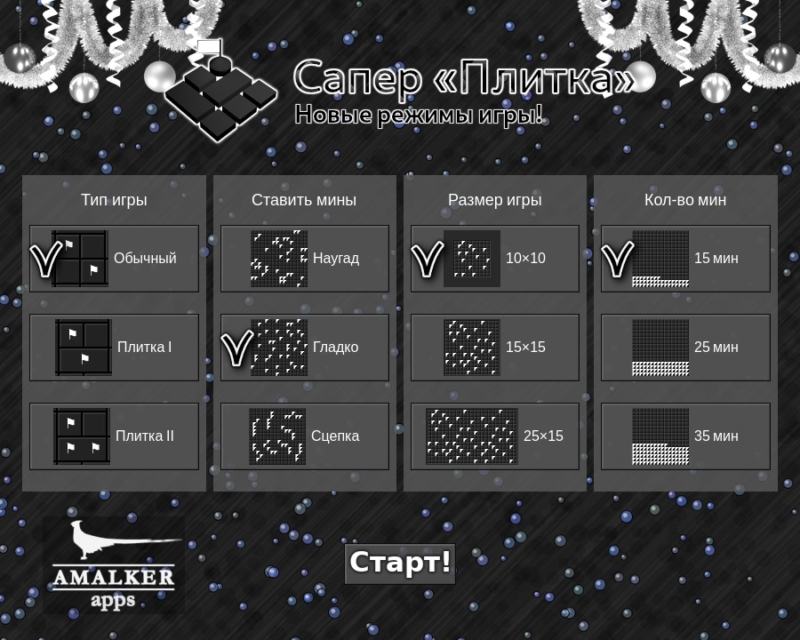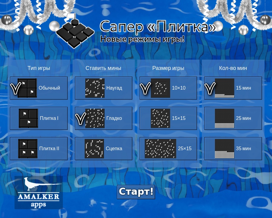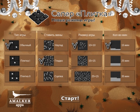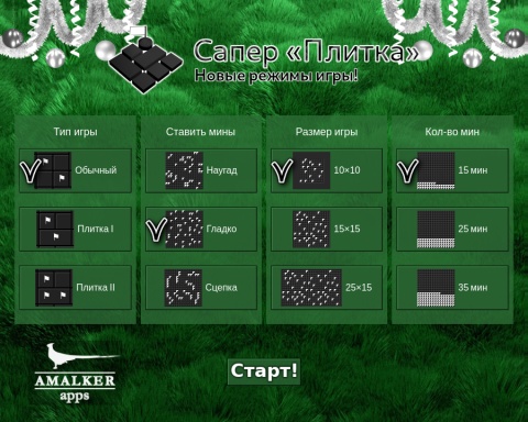 Некоторые пары соседних квадратов объединяются в плитки. В режиме I за плиткой может быть спрятана одна мина, которая учитывается во всех ближайших числах. В режиме II за плиткой может быть спрятано две мины (либо ноль), которые так же учитываются в ближайших числах. Обычные (не плитка) квадраты работают в обычном режиме. Кстати, чтобы увидеть отличия от классического режима, посмотрите на скриншоты решенных игр.